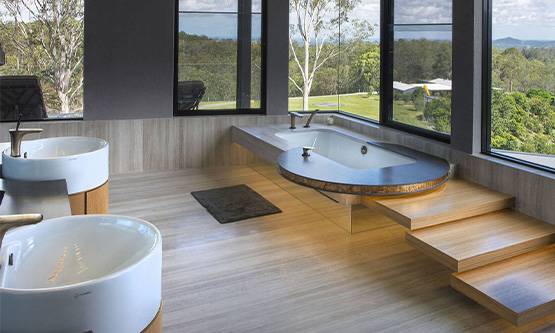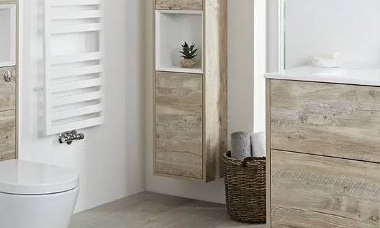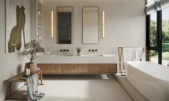 Posljednjih godina svi pričaju o prirodnim materijalima u enterijeru, i kupatilo nije izuzetak – 2025. donosi nam povratak prirodi u punom sjaju. To znači da keramičke pločice visokog sjaja polako ustupaju tron mat pločicama koje podsjećaju na prirodni kamen, da se u kupatilu sve češće viđa pravo drvo ili njegov veoma uvjerljiv "dvojnjak" u vidu porculanskih pločica koje imitiraju drvo. Cilj je stvoriti topao, organski ambijent – kao spoj moderne kupaonice i zen vrtlarije.