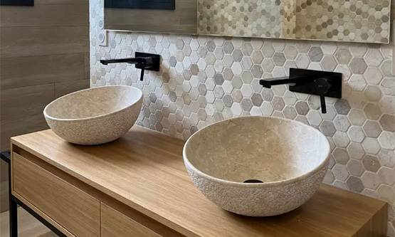 - Lavabo Menorca Beige: “Mediteran na dlanu”. Okrugli kamen lavabo prečnika ~42 cm, glatkih ivica i tople bež nijanse. Postavljen na ploču ormarića, postaje fokusna tačka prostora. Uparivanje s drvenom pločom ormarića ili crnim mat armaturama daje moderan kontrast. Dio ekskluzivne serije "Lavabos Piedra Natural – Trip by Mosavit", ručno izrađen i izdržljiv.