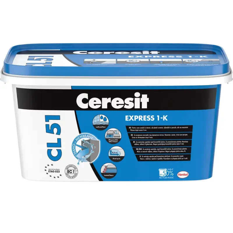 Ceresit CL 51 Express 1-K je jednokomponentni fleksibilni premaz za hidroizolaciju ispod keramičkih pločica u vlažnim i mokrim prostorijama, idealan za unutrašnju upotrebu. Ovaj premaz stvara vodonepropusni sloj koji štiti zidove i podove od prodora vlage, čime sprečava pojavu buđi, fleka i oštećenja podloge.