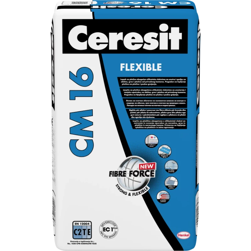 CM 16 flex ljepilo je fleksibilno ljepilo obogaceno silikatnim vlaknima (Fibre Force)i idealno za vanjsku i unutrašnju upotrebu, a pogodno je za sistem plocica na plocicu. Sa svojom posebno visokom fleksibilnošcu, ovo ljepilo nudi snažno prianjanje i omogucava sušenje i vezivanje bez skupljanja. Ovo ljepilo je posebno efikasno za polaganje gres plocica, prirodnog kamena i sistema podnog grejanja, kao i za postavljanje plocica na gipsane table, suve košuljice, gips, zasicen beton i vodonepropusne slojeve (osim crne bitumenske hidroizolacije). Fleksibilno ljepilo je takode pogodno za primenu u vlažnim prostorima, kao što su kupatila, bazeni, terase, balkoni sa odgovarajucim dilatacionim spojevima, stepeništa, podno grejanje, fasade, OSB ploce i na postojecim keramickim oblogama.