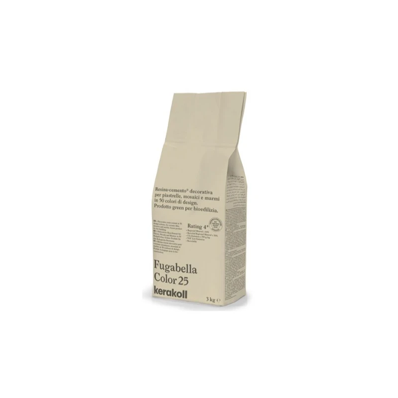 Kerakoll Fugabella Color 25 u pakovanju od 3 kg je dekorativna resina-cemento masa koja omogućava fugovanje od 0 do 20 mm na keramičkim, porcelanskim i kamenim pločicama, kako za unutrašnju, tako i za spoljašnju upotrebu. Ova cementna baza s minimalnim upijanjem vode pruža izuzetnu vodoodbojnost i otpornost na abraziju, čime se sprječava prodiranje vlage i formiranje prljavštine u spojevima.