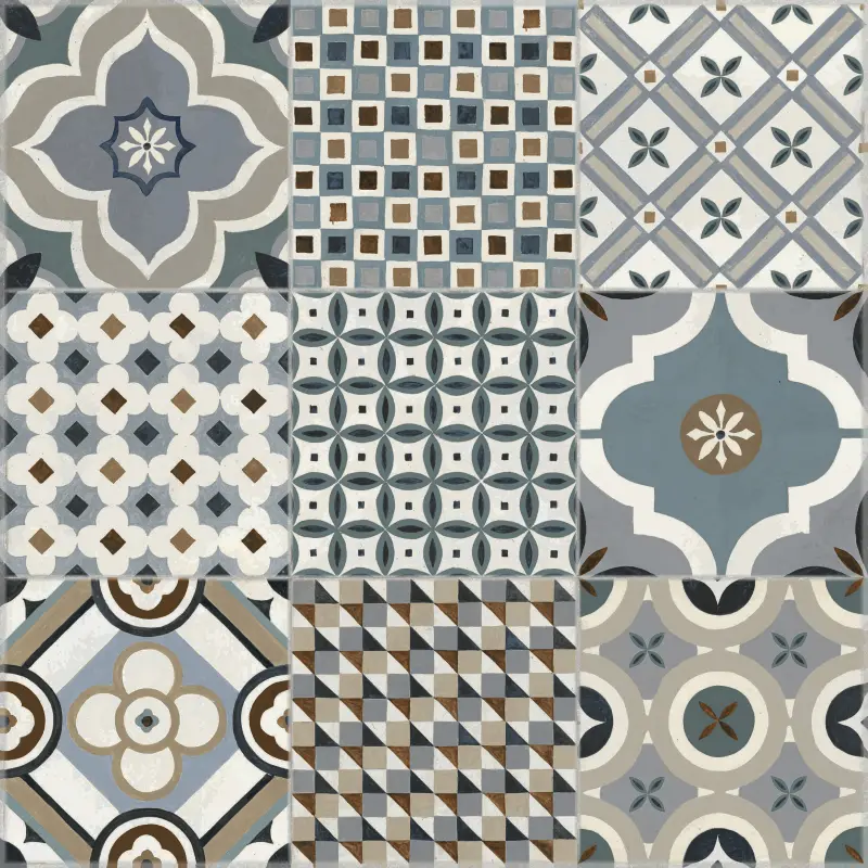 Zahvaljujući glaziranoj površini i mat završnici, pločica odiše prirodnošću, dok višebojni dekor u patchwork stilu donosi razigran i originalan izgled. Sa rustičnim detaljima i nijansama sive, plave i bež, ova pločica lako se uklapa u različite enterijere – od mediteranskih do urbanih.