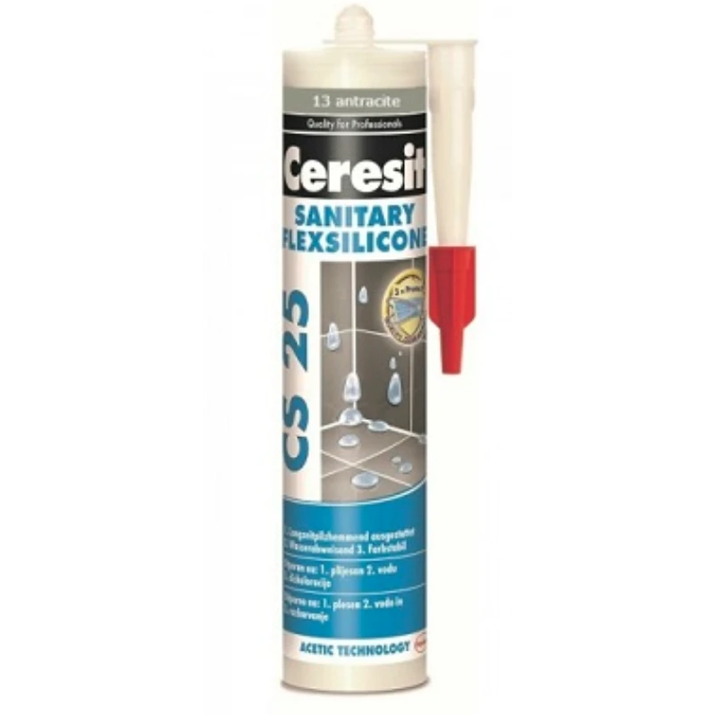 Silikon CS 25 antracit 13 280 ml je sanitarni silikon koji se koristi za zaptivanje rubnih spojeva na zidovima i podovima, kao i za rubne spojeve sanitarija i opreme u kupatilima, kuhinjama i drugim prostorijama s povecanom vlagom. Ovaj silikon se odlicno prianja na brojne površine poput keramike, stakla, emajla, glaziranih plocica, plastike (PMMA), aluminijuma i drugih materijala.