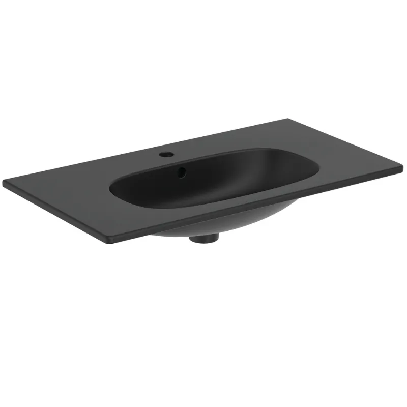 TESI T3509V3 je ugradni umivaonik širine 83 cm, iz kolekcije TESI by Studio Levien, izrađen od finog šamota sa mat crnom završnom obradom (V3 – Svilena Crna). Ovaj model ima jedan centralni otvor za bateriju i preliv, što ga čini idealnim za moderne kupatilske kompozicije.