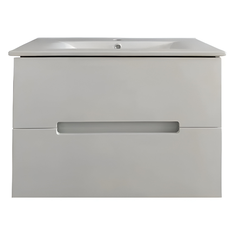 Konstrukcija ormarića izrađena je od medijapana premazanog bijelim poliuretanskim lakom visokog sjaja, što obezbeđuje dugotrajnu zaštitu od vlage i zadržava besprekoran izgled tokom godina korišćenja. Ormarić ima dve fioke sa sistemom sporog zatvaranja, koje omogućavaju tiho i sigurno korišćenje bez naglih udaraca. Model je konzolni (viseći), što znači da se montira na zid i ostavlja prostor ispod slobodnim – savršeno rešenje za lakše čišćenje i moderniji vizuelni utisak.
